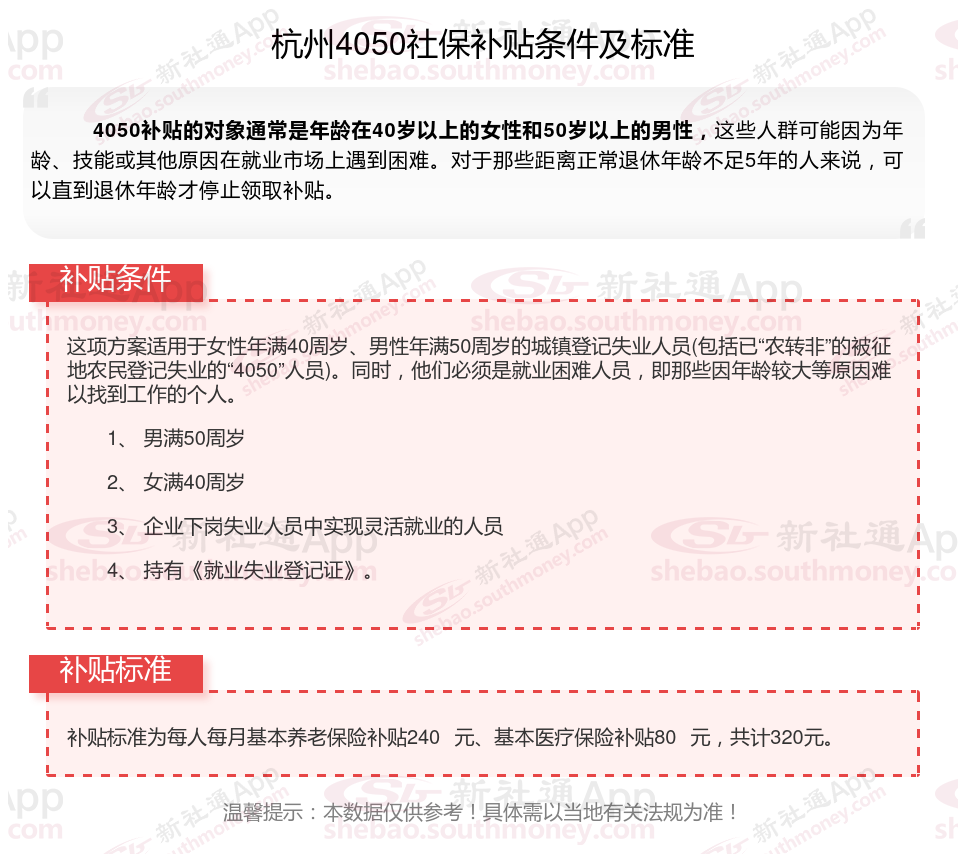 2025杭州4050补贴主要针对的是年龄在40岁以上的女性和50岁以上的男性,这些人群通常因为年龄较大而面临就业困难。