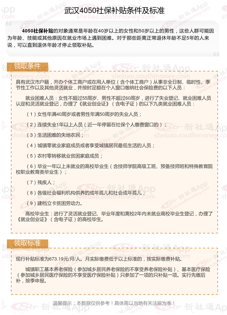 多数地区只有4050人员可以领取社保补贴,现在扩大了补贴对象及范围,通过就业困难人员认证,实现灵活就业,并且自己缴纳职工社保的灵活就业人员,一般都能申请灵活就业社保补贴。那么武汉4050灵活就业社保补贴标准是多少钱?武汉4050社保补贴条件是什么?接下来随新社通APP小编了解一下最新资讯。