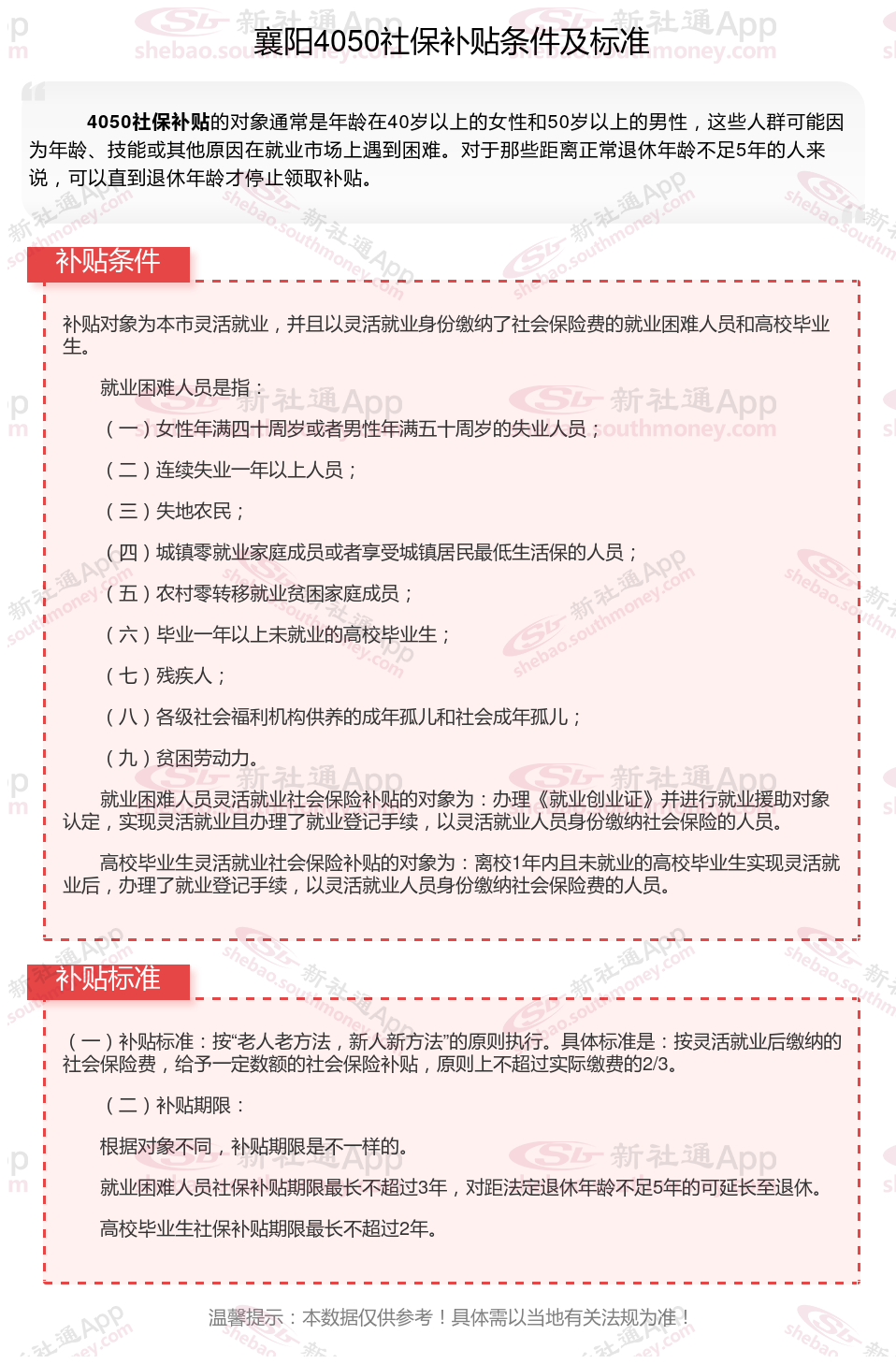 2025襄阳4050补贴主要针对的是年龄在40岁以上的女性和50岁以上的男性,这些人群通常因为年龄较大而面临就业困难。