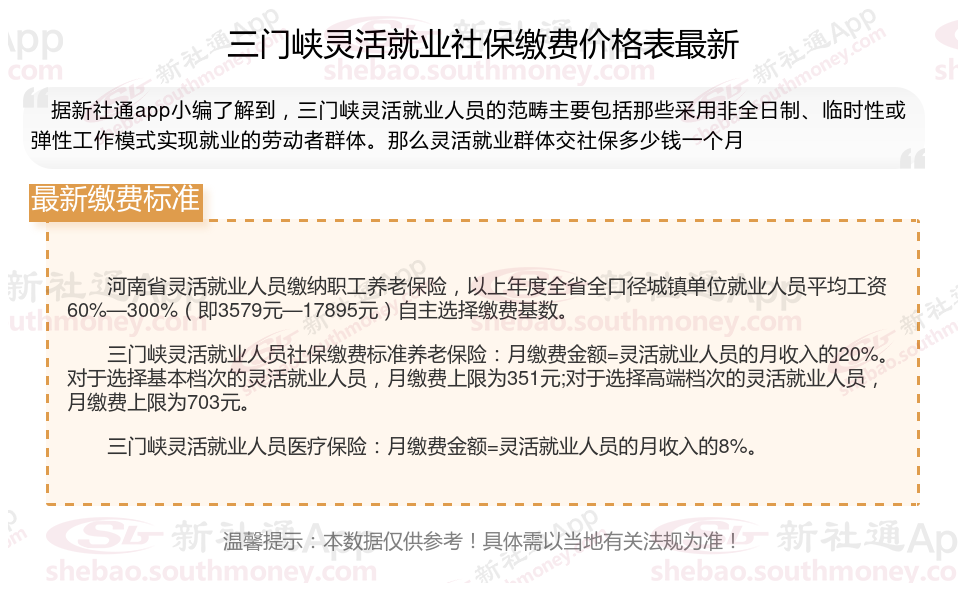 以上就是新社通小编带来三门峡灵活就业社保缴费知识,内容供参考,希望对你有帮助,欢迎关注/下载新社通APP解锁更多社保专业资讯。