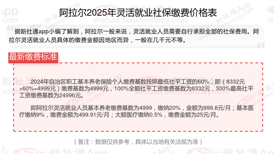 据新社通app数据显示,阿拉尔灵活就业人员养老保险缴费基数2024-2025年最新标准如下: