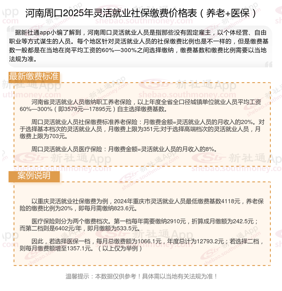 据新社通app数据显示,河南周口企业灵活就业养老保险的缴费基数为:3579元。