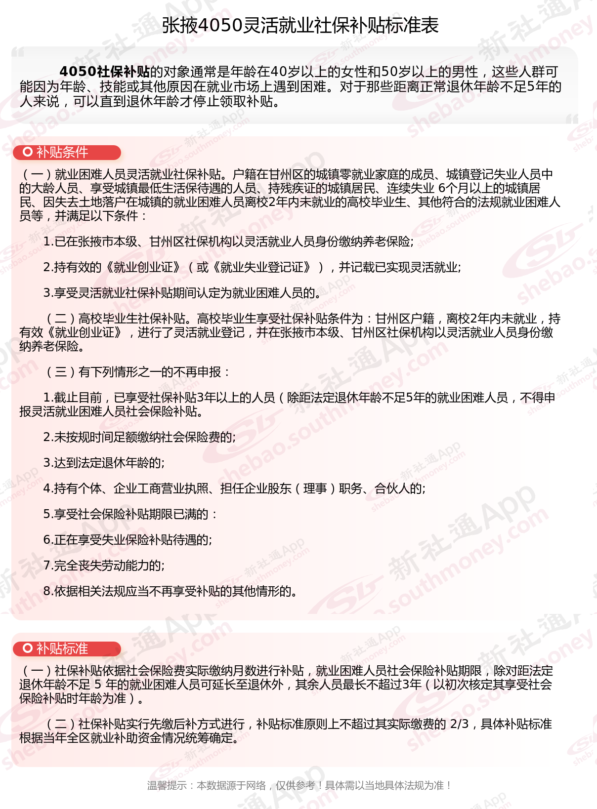以上就是张掖4050灵活就业社保补贴的相关内容,欢迎关注新社通/下载新社通APP了解更多五险一金专业资讯。