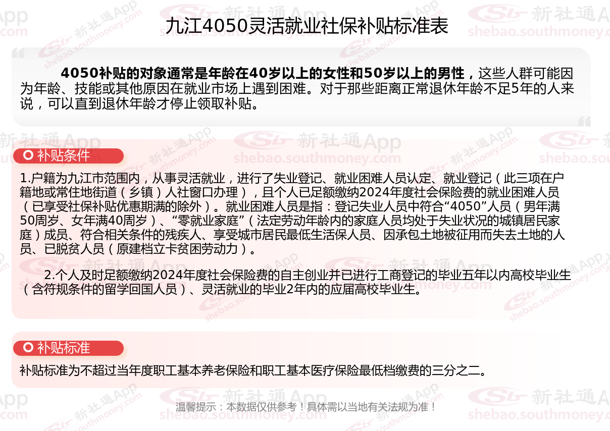 2025九江4050补贴主要针对的是年龄在40岁以上的女性和50岁以上的男性,这些人群通常因为年龄较大而面临就业困难。