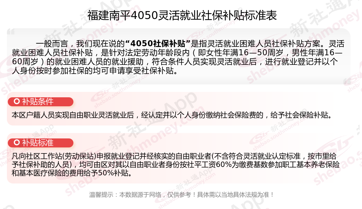 以上就是福建南平4050灵活就业社保补贴的相关内容,欢迎关注新社通/下载新社通APP了解更多五险一金专业资讯。