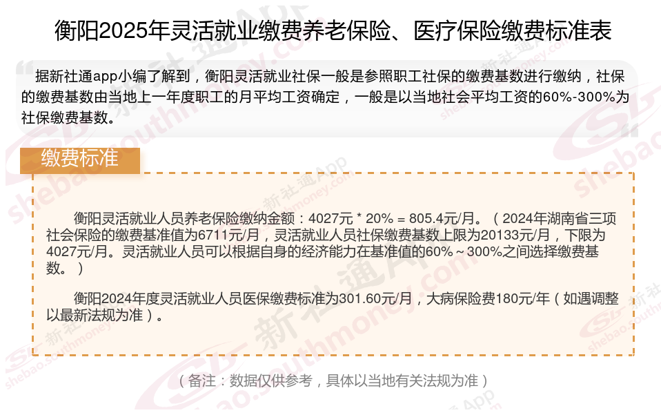 据新社通app数据显示,衡阳灵活就业养老保险的缴费基数为:4027元。灵活就业人员参保缴费的比例为个人20%。