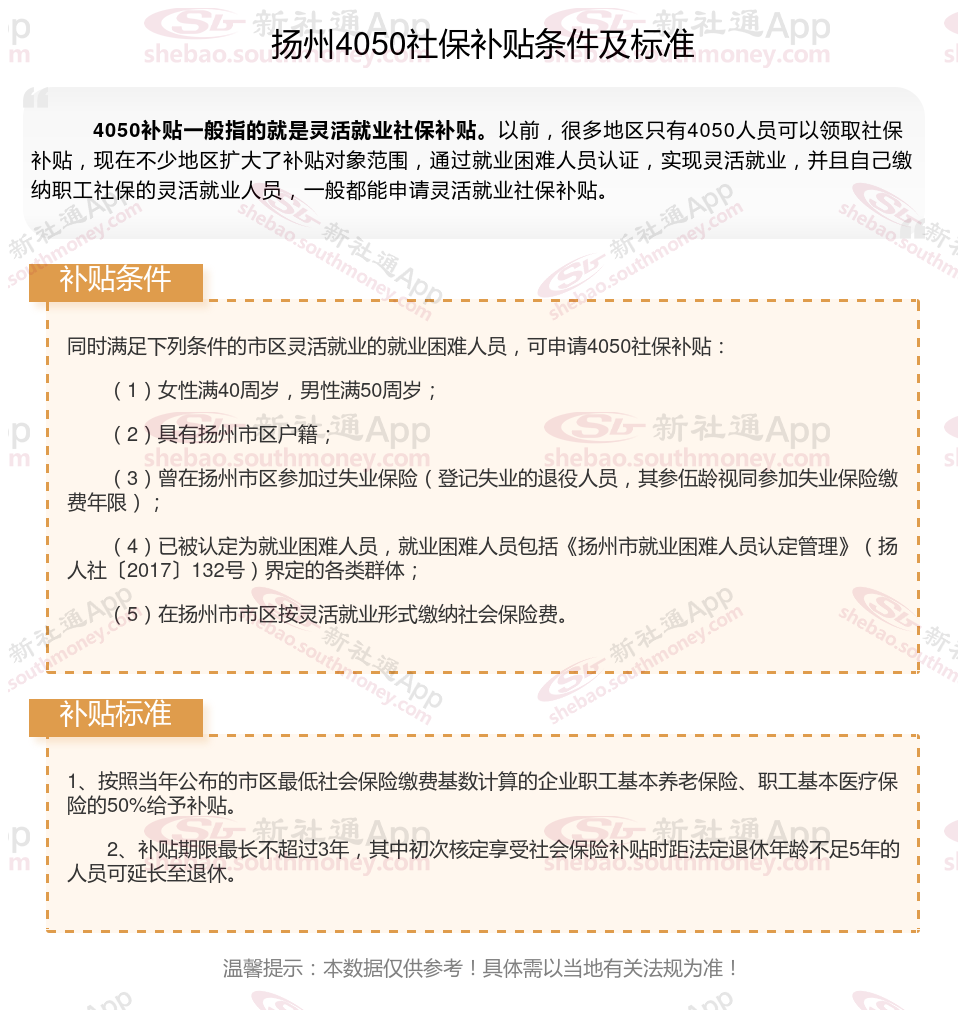 4050补贴主要是针对大龄就业困难人群的社保补贴,申请条件包括年龄、就业困难、灵活就业并自费缴纳社保,需要持有失业登记证,不同地区可能有细微差别,比如农村户口的限制。那么扬州4050灵活就业社保补贴标准是多少钱?扬州4050社保补贴条件是什么?接下来随新社通APP小编了解一下最新资讯。