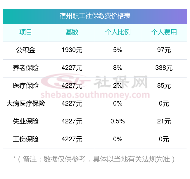 2025年宿州5险缴费标准是多少,2025年宿州社保缴费多少钱?下表是2025年宿州社保费用明细参考,新社通app-社保缴费查询工具提供的最新数据如下: