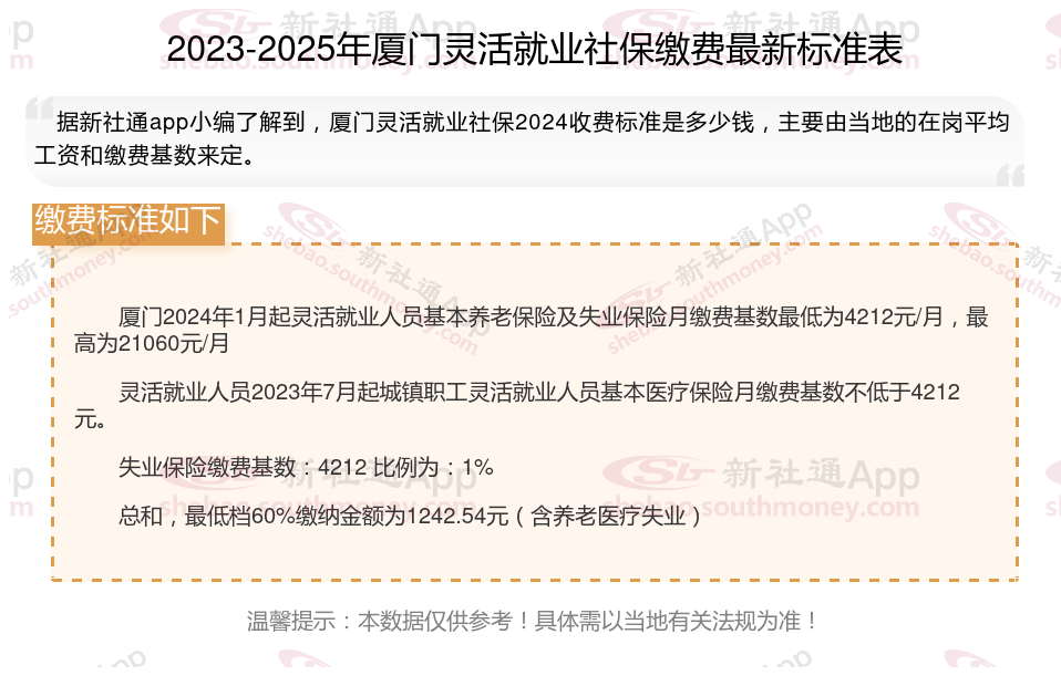 据新社通app数据显示,厦门灵活就业养老保险缴费基数2024-2025年最新标准如下: