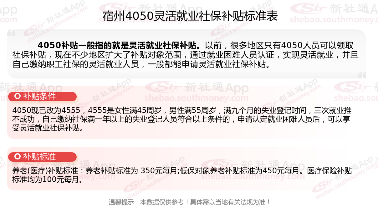 一、2025年宿州4050社保补贴标准及条件是多少?