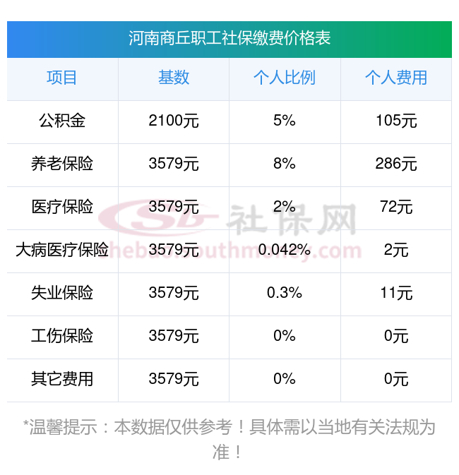 2025年河南商丘社保缴费多少钱?下表是2024-2025年河南商丘社保费用明细参考,新社通app-社保缴费查询工具提供的最新数据如下: