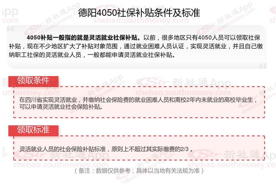 以上就是德阳4050灵活就业社保补贴的相关内容,欢迎关注新社通/下载新社通APP了解更多五险一金专业资讯。