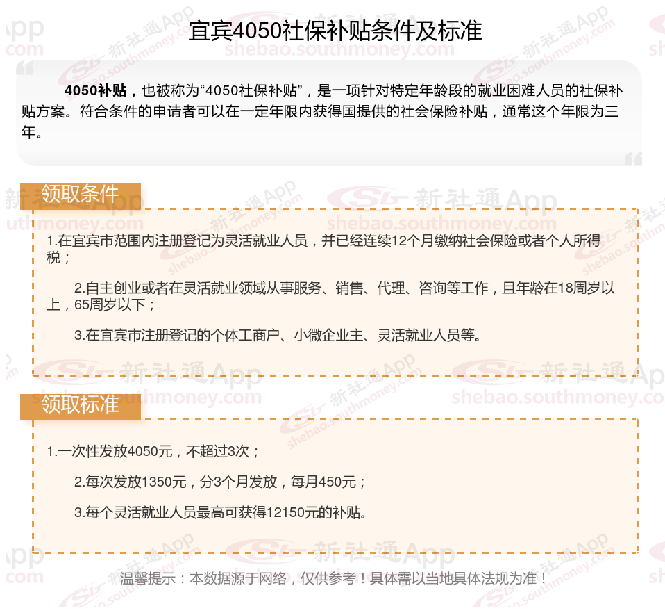 4050社保补贴标准据新社通app小编了解,通常,4050社保补贴包含基本医疗保险和基本养老保险两个险种,社保补贴金额为申请人实际缴纳基本养老保险和基本医疗保险金额的2/3,具体标准以当地社保局公布的数据为准!那么宜宾灵活就业人员4050补贴最新标准是多少,宜宾4050灵活就业人员社保补贴一年可以有多少钱?接下来随新社通APP小编具体了解一下4050社保补贴内容。