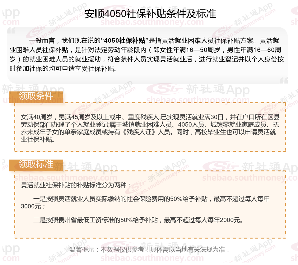 二、2025年安顺4050社保补贴标准及条件,最新如下: