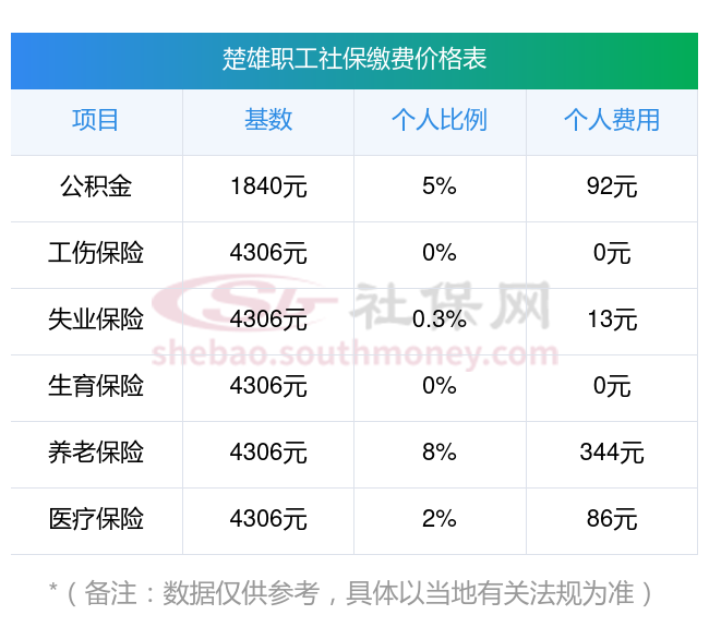楚雄社保个人缴费比例是多少?和新社君一起来看看2024-2025年楚雄最低社保费用明细参考,新社通app-社保缴费查询工具提供的最新数据如下: