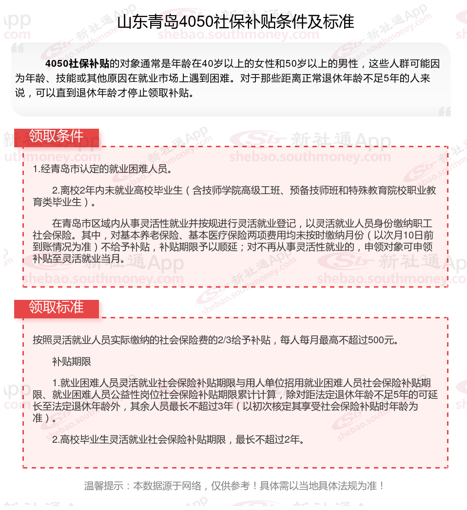 二、山东青岛4050社保补贴标准及条件4050社保补贴,最新如下