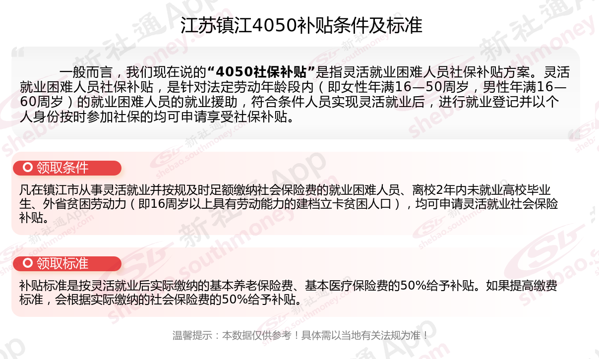 4050补贴需要以灵活就业身份参加职工养老和医疗保险,补贴标准不超过实际缴费的三分之二,最长3年,距离退休不足5年的可延长到退休。补贴对象包括国企下岗人员、低保家庭等。申请流程需要提交身份证、银行账户等。那么江苏镇江4050灵活就业社保补贴标准是多少钱?江苏镇江4050社保补贴条件是什么?接下来随新社通APP小编了解一下最新资讯。