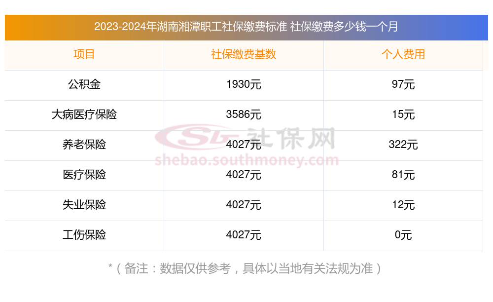 2025年湖南湘潭社保缴费多少钱?下表是2023-2024年湖南湘潭社保费用明细参考,新社通app-社保缴费查询工具提供的最新数据如下: