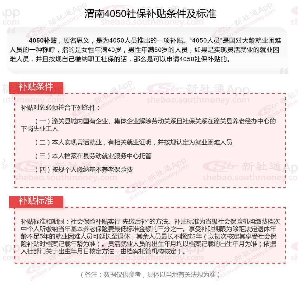 今天聊一下4050补贴的相关内容。4050补贴听起来像是一个针对特定年龄人群的社保补贴。比如女性需年满40周岁,男性需年满50周岁(以申请当年12月31日为截止日期)。那么渭南4050灵活就业困难人员社保补贴多少钱?渭南4050社保补贴可以申请吗?接下来随新社通APP小编具体了解一下4050社保补贴内容。