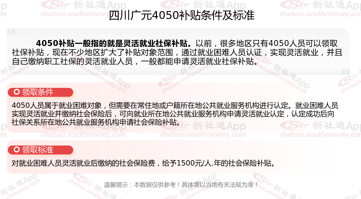 2025四川广元灵活就业4050社保补贴是一项面向特定年龄段的就业困难人群的社会保险补贴。