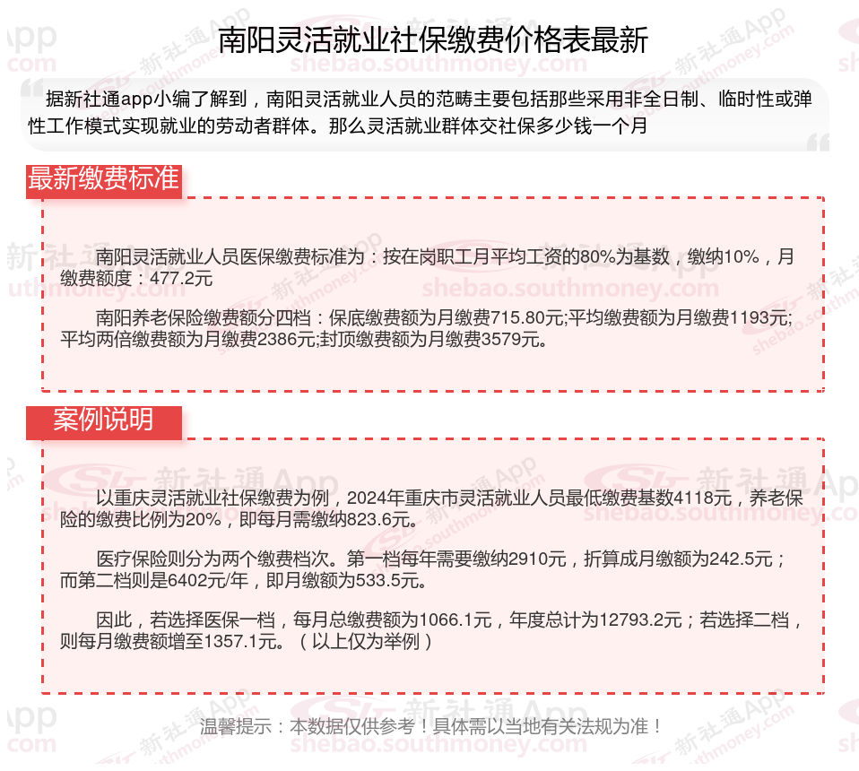 据新社通app数据显示,南阳灵活就业养老保险缴费基数2024-2025年最新标准如下: