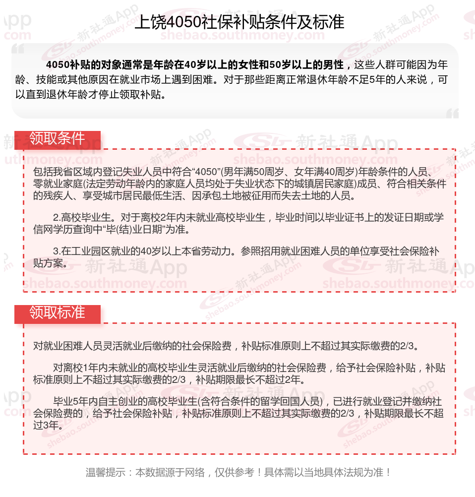 二、2025年上饶4050社保补贴标准及条件,最新如下: