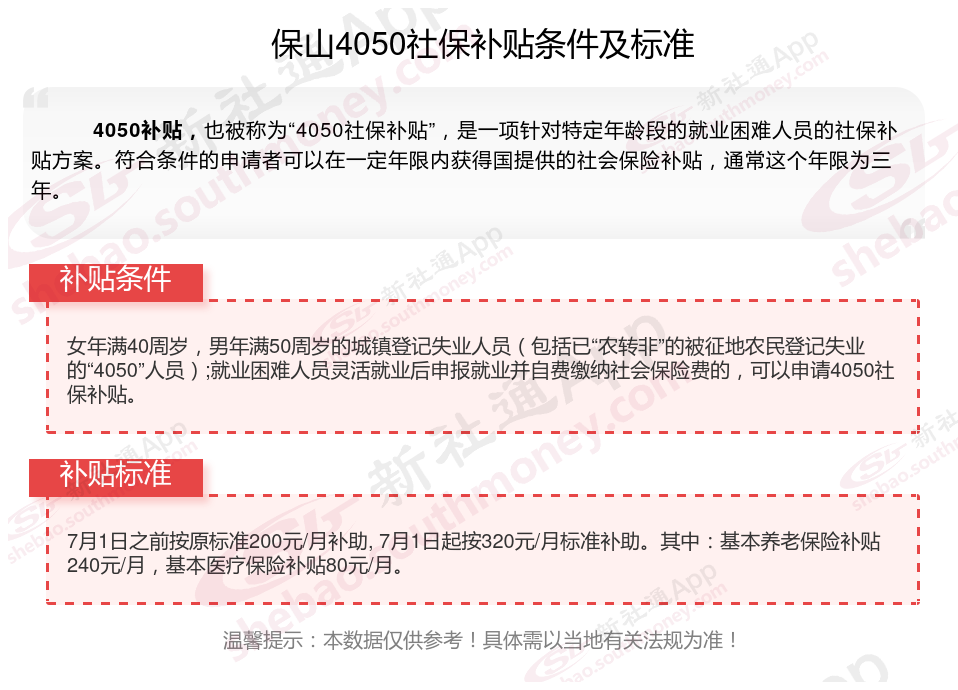 二、2025年保山4050社保补贴标准是多少?条件是什么?