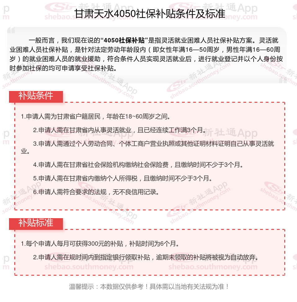 一、2023-2024年甘肃天水4050社保补贴标准及条件是多少?
