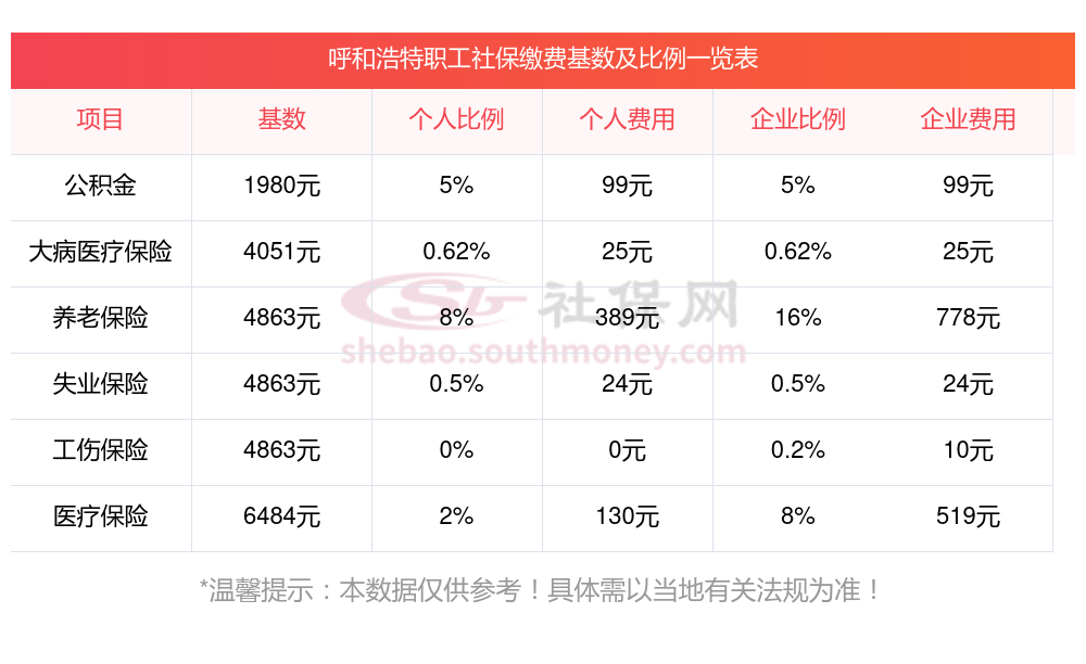 2025年呼和浩特社保缴费多少钱?呼和浩特社保公积金缴费基数为:3579.00元,个人比例 : 0.08,下表是2025呼和浩特社保费用明细参考,新社通app-社保缴费查询工具提供的最新数据如下: