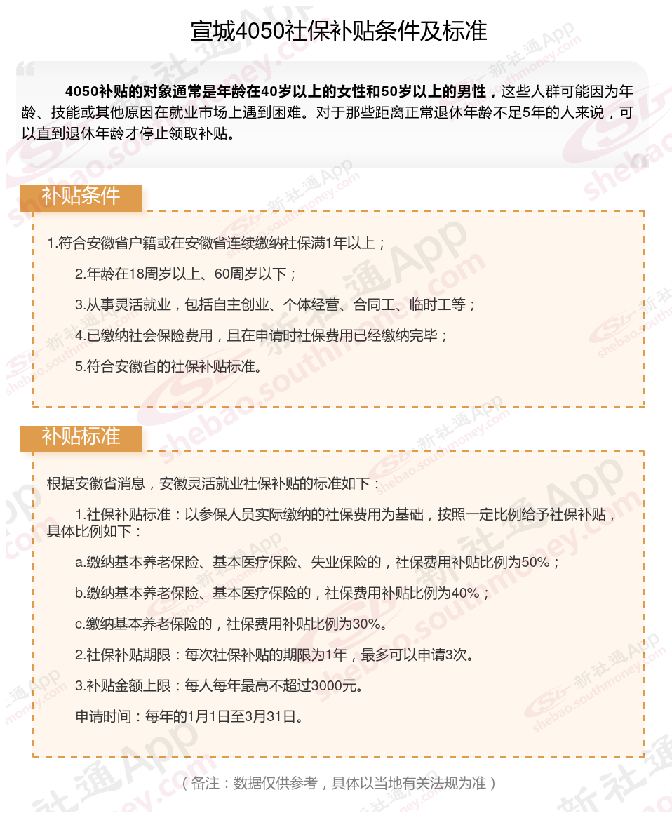 4050社保补贴标准据新社通app小编了解,通常,4050社保补贴包含基本医疗保险和基本养老保险两个险种,社保补贴金额为申请人实际缴纳基本养老保险和基本医疗保险金额的2/3,具体标准以当地社保局公布的数据为准!那么宣城灵活就业人员4050补贴最新标准是多少,宣城4050灵活就业人员社保补贴一年可以有多少钱?接下来随新社通APP小编具体了解一下4050社保补贴内容。