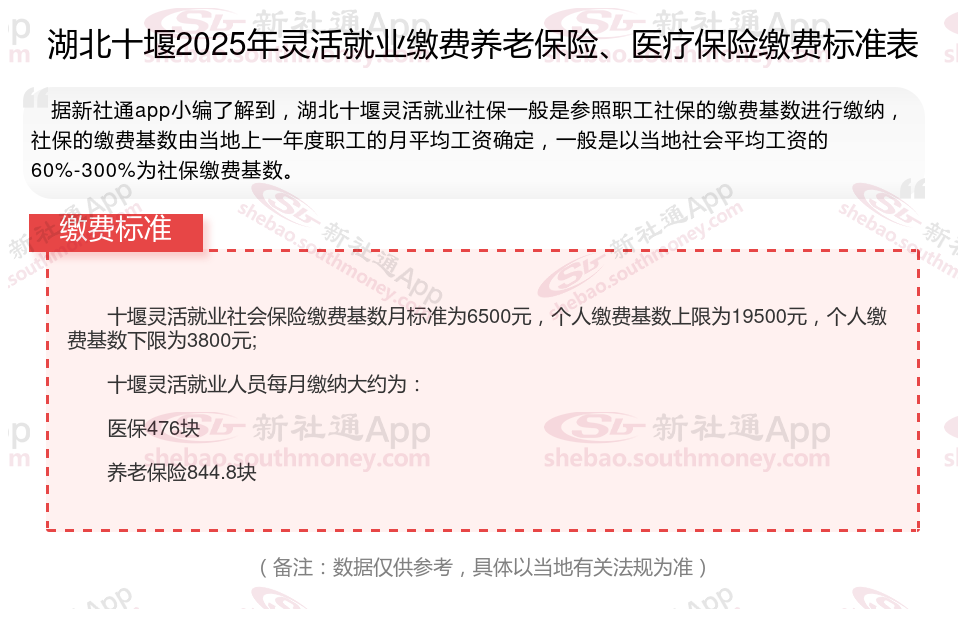 据新社通app数据显示,湖北十堰灵活就业养老保险的缴费基数为:3800元。灵活就业人员参保缴费的比例为个人20%。