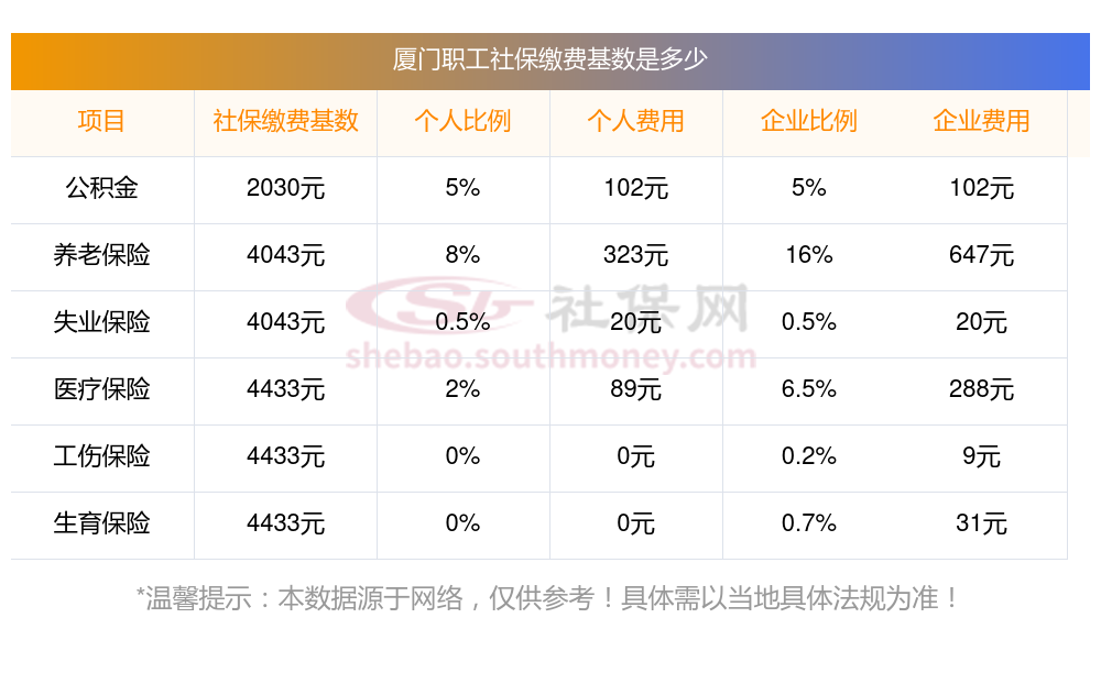 2025年厦门社保缴费最低基数及个人和单位具体是多少钱?下表是2025年厦门社保费用明细参考,新社通app-社保缴费查询工具提供的最新数据如下: