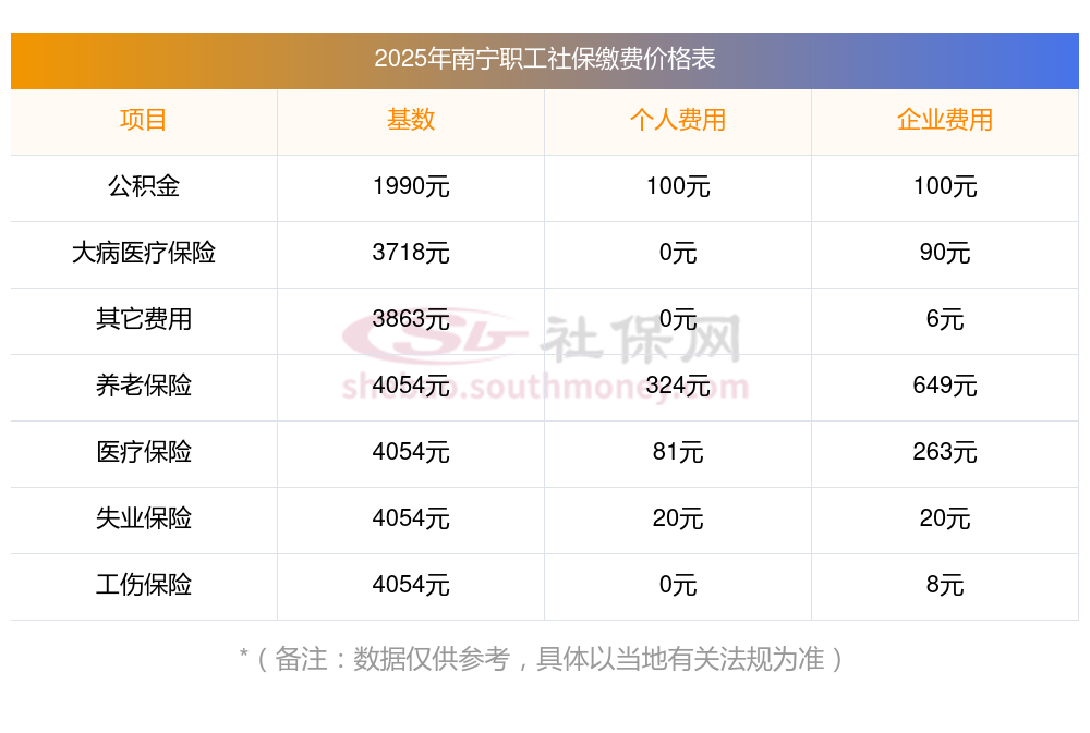 2025年南宁社保缴费价格,2025年南宁社保缴费多少钱?下表是2025年南宁社保费用明细参考,新社通app-社保缴费查询工具提供的最新数据如下: