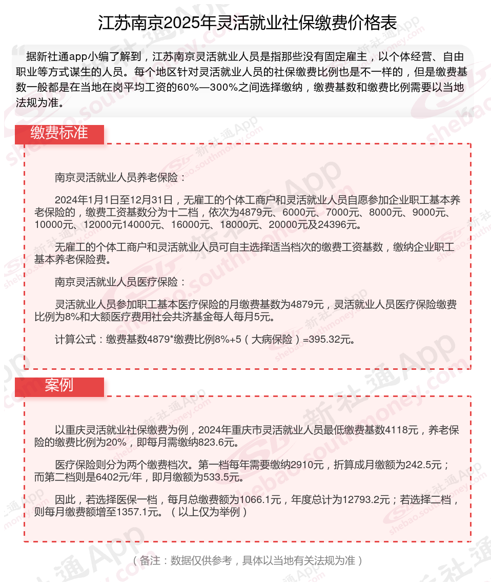 据新社通app数据显示,江苏南京企业灵活就业养老保险的缴费基数为:4494元。