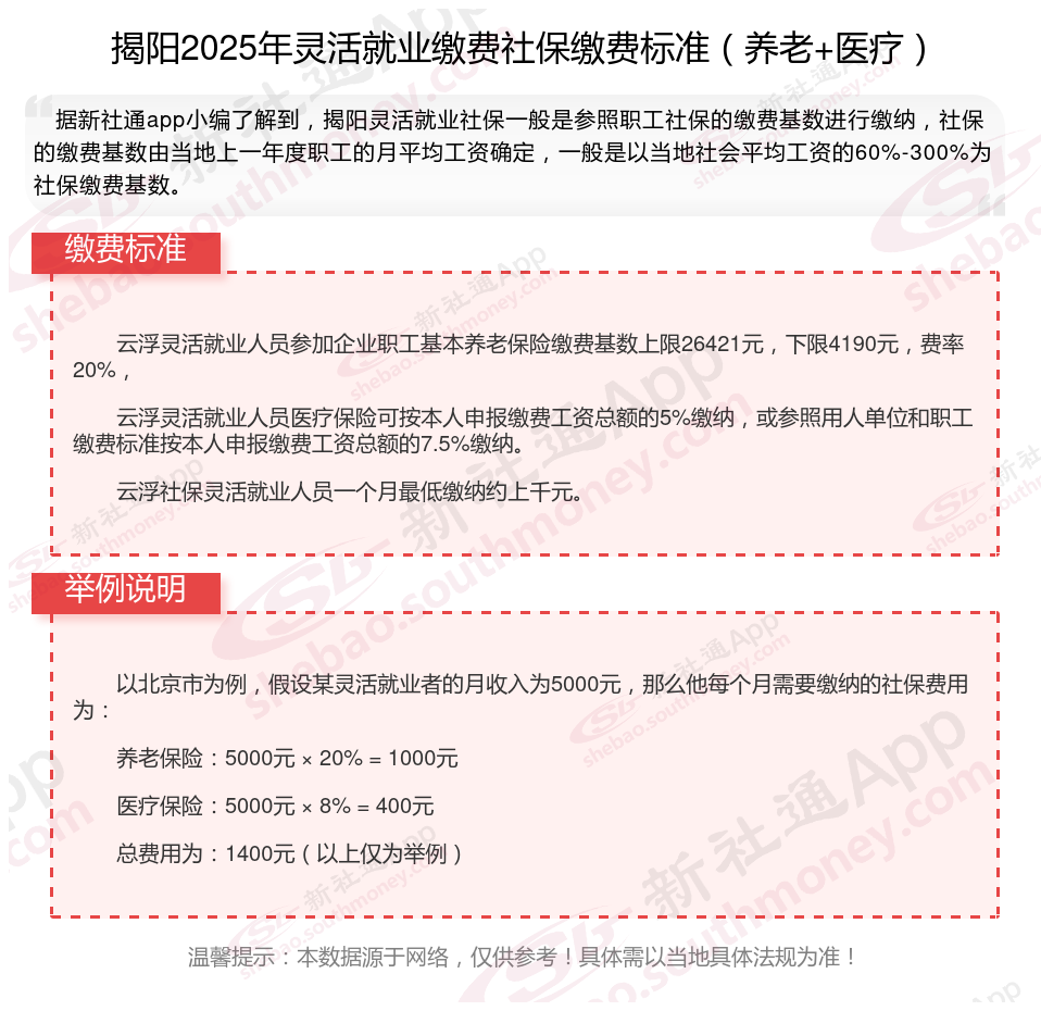 据新社通app数据显示,揭阳灵活就业养老保险缴费基数2024-2025年最新标准如下: