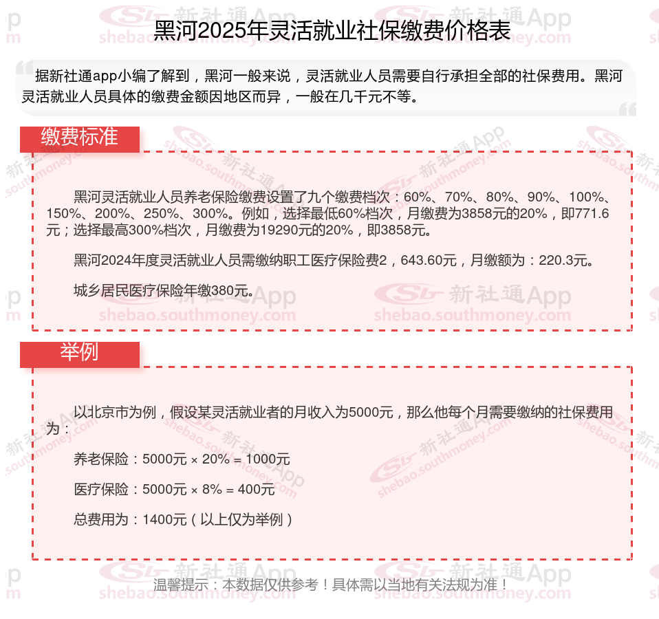 据新社通app数据显示,2024-2025年黑河灵活就业人员养老保险的缴费标准是根据缴费基数来确定的: