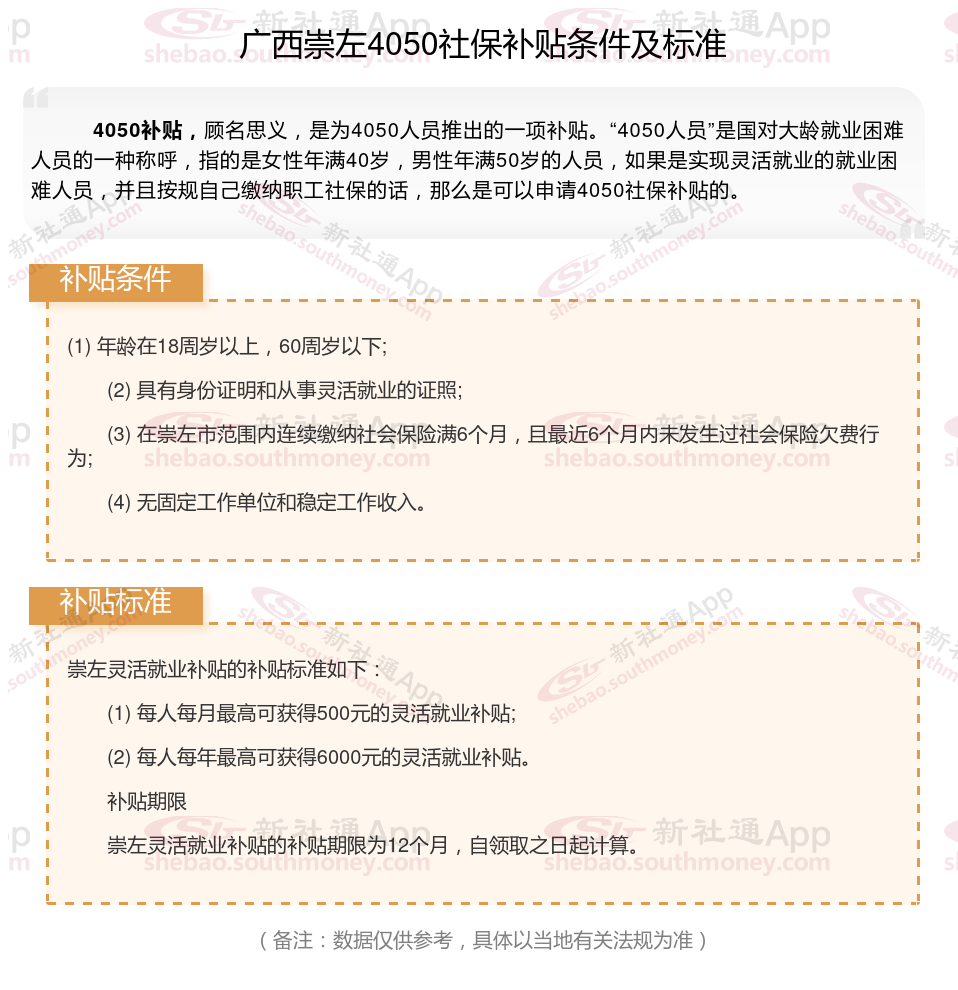 一、广西崇左4050社保补贴标准及条件2025年最新消息