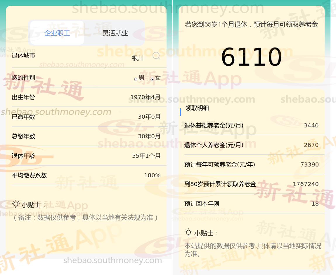 孔某,1970年出生于宁夏银川,是一位拥有30年社保缴费记录的退休职工,缴费档次为180%。辛勤工作多年后,她迎来了退休生活。通过新社通app养老金计算器计算所得,孔某得知自己每月可以领取到基础养老金约3440元,加上个人养老金约2670元,总计6110元。虽然金额不算多,但对于孔某来说,这是一份稳定的收入来源,为她的退休生活增添了一份安心与保证。