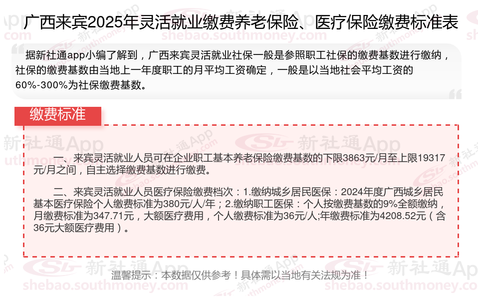 据新社通app数据显示,广西来宾灵活就业养老保险的缴费基数为:4053.6元。灵活就业人员参保缴费的比例为个人20%。