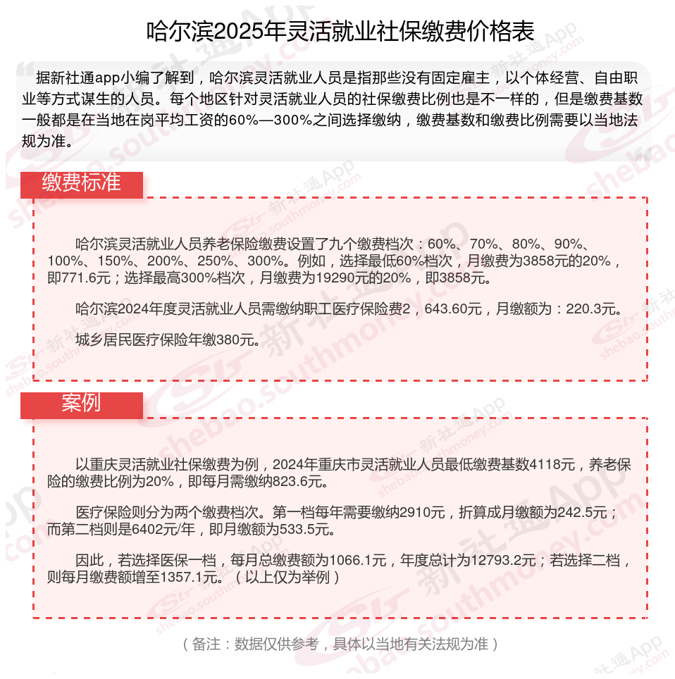 据新社通app数据显示,哈尔滨灵活就业人员养老缴费基数2024-2025年最新标准如下: