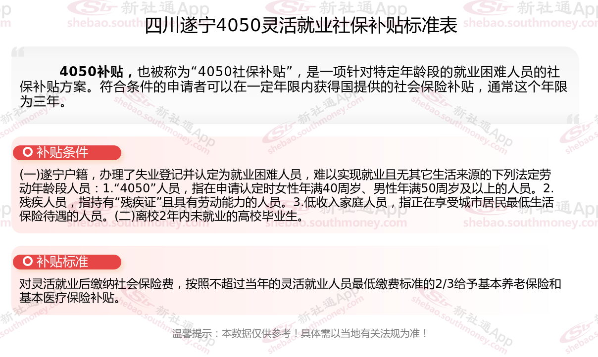 二、2025年四川遂宁4050社保补贴标准及条件,最新如下: