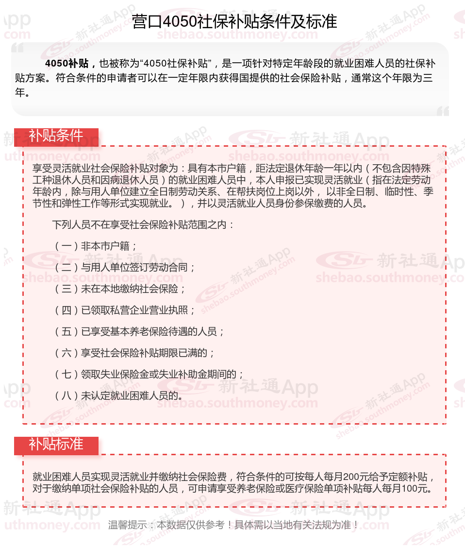 2025营口4050补贴主要针对的是年龄在40岁以上的女性和50岁以上的男性,这些人群通常因为年龄较大而面临就业困难。