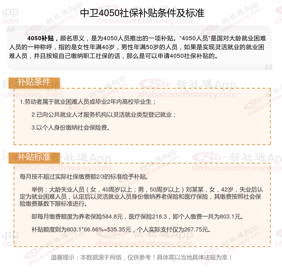 今天聊一下4050补贴的相关内容。4050补贴听起来像是一个针对特定年龄人群的社保补贴。比如女性需年满40周岁,男性需年满50周岁(以申请当年12月31日为截止日期)。那么中卫4050灵活就业困难人员社保补贴多少钱?中卫4050社保补贴可以申请吗?接下来随新社通APP小编具体了解一下4050社保补贴内容。