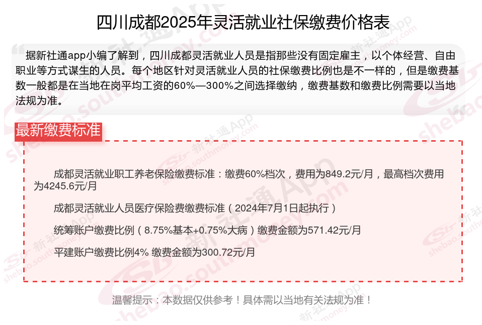 据新社通app数据显示,四川成都灵活就业养老保险缴费基数2024-2025年最新标准如下: