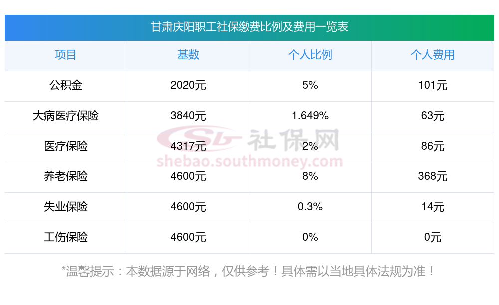 2025年甘肃庆阳社保缴费多少钱?社保要缴够多少年可以退休?下表是2024-2025年甘肃庆阳社保费用明细参考,新社通app-社保缴费查询工具提供的最新数据如下: