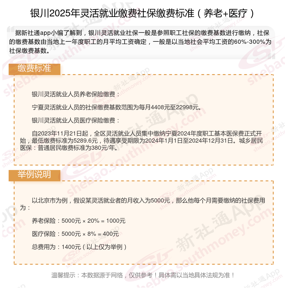 据新社通app数据显示,银川灵活就业养老保险缴费基数2024-2025年最新标准如下: