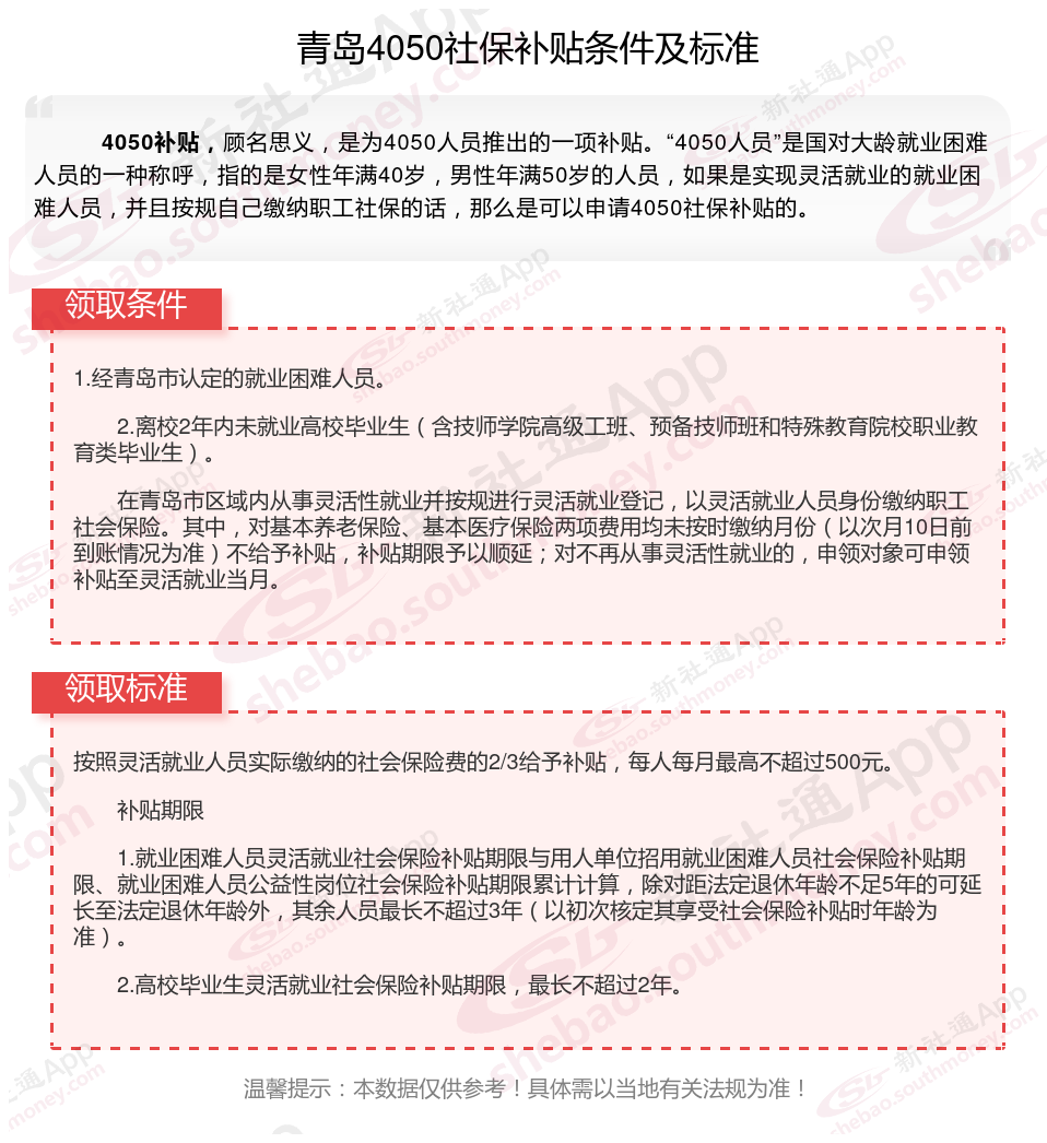 二、2025年青岛4050社保补贴多少钱?4050社保补贴领取条件什么?