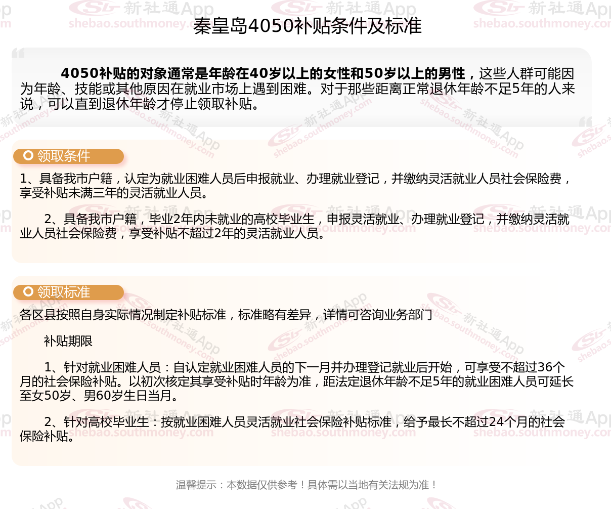 二、2025年秦皇岛4050社保补贴标准及条件,最新如下: