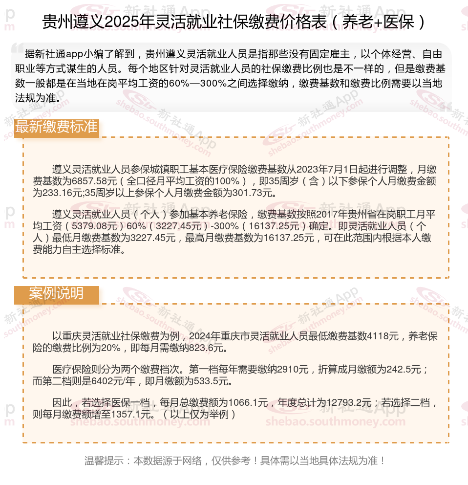 据新社通app数据显示,贵州遵义灵活就业养老保险缴费基数2024-2025年最新标准如下: