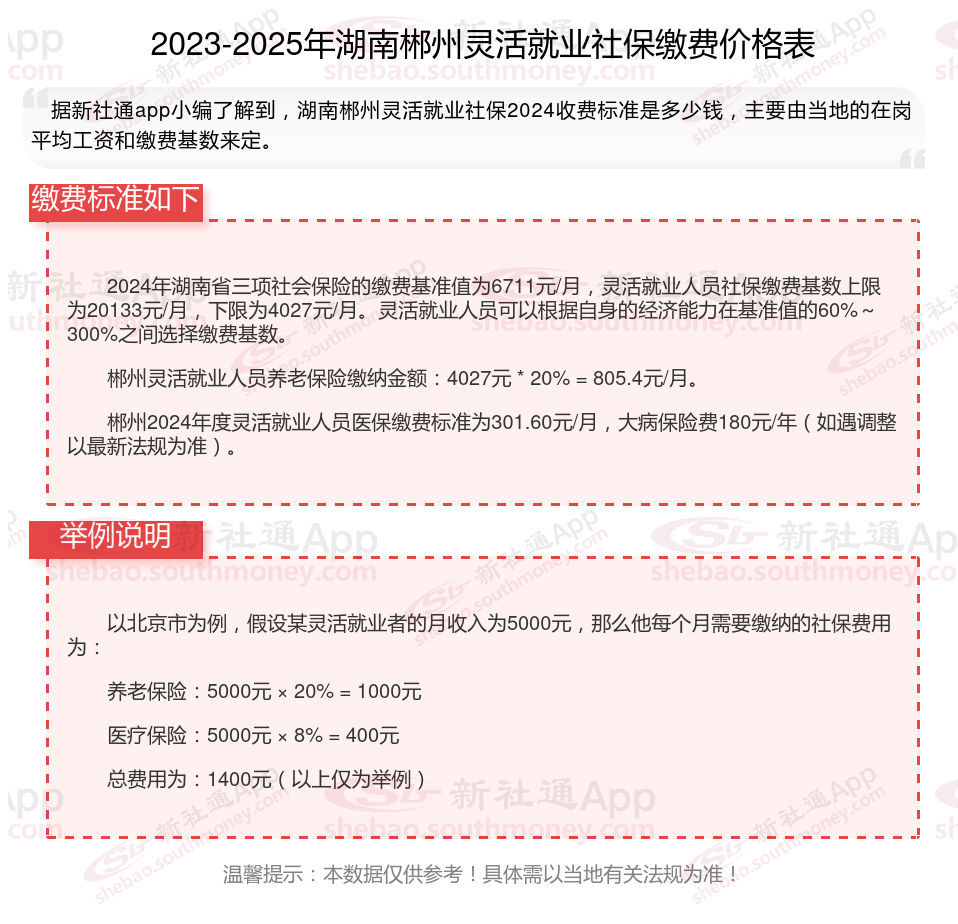 据新社通app数据显示,湖南郴州灵活就业养老保险缴费基数2024-2025年最新标准如下: